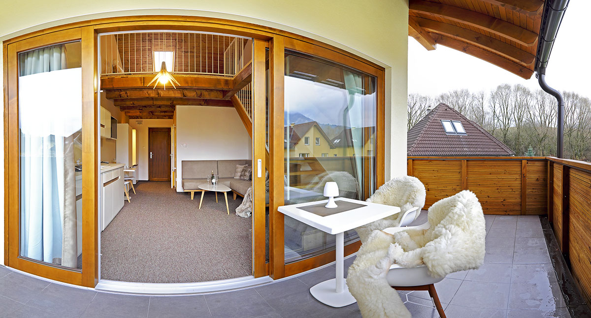 Moderné mezonetové štúdio na poschodí, s vlastným vchodom a s výhľadom na hory a do záhrady.
